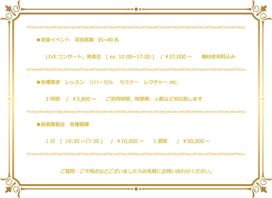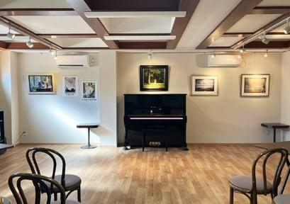 明るいフローリングとオフホワイトの壁、ブラウンの天井デコレ-ションは、すっきりと使いやすい空間となっております。窓の外には空が広がり換気も簡単、また遮光ロールカーテンにより日中の空間演出も容易です。絵画・書・写真展・LIveコンサート,朗読会,弾き語り,各種ワークショップなどにお楽しみいただけます。ステージ位置や客席も目的に合わせてご自由なレイアウトが可能です。